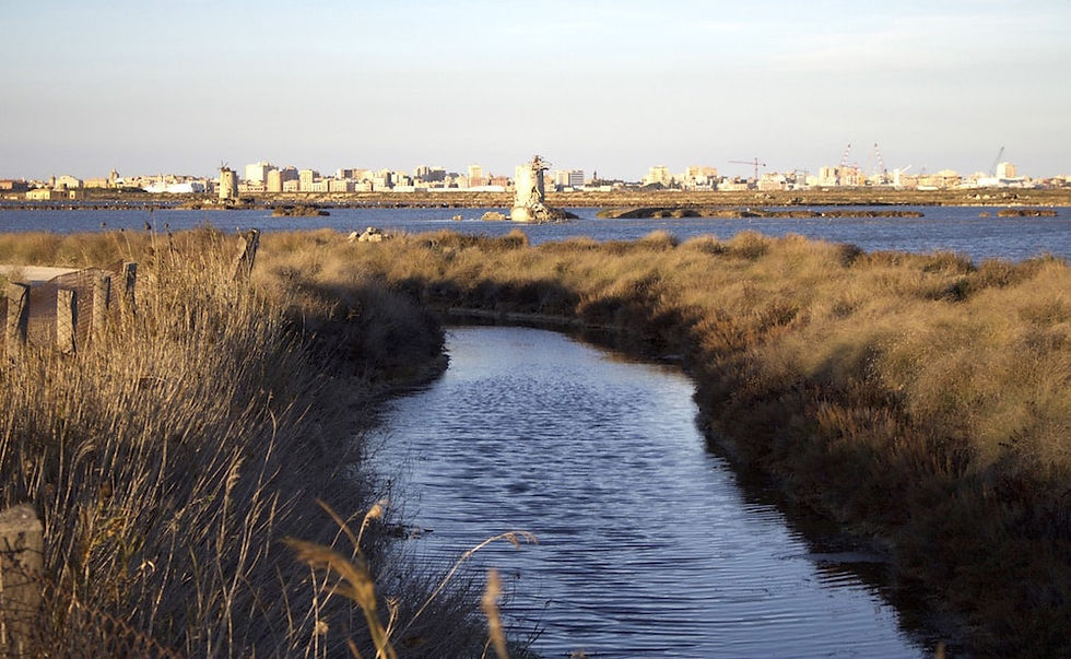 We once more move on by car - for the sunset we want to go to a nice spot along the coast, from which the view should be one of the best onto the salt basins. But before we stop again along the way, marveling at the beautiful landscape. The water here engulfed large strips of land, and leaves small grass islands to stick out of the water, with windmills and small towers spread everywhere. They sometimes appear to be growing out of the water instead of sitting on an actual solid underground.