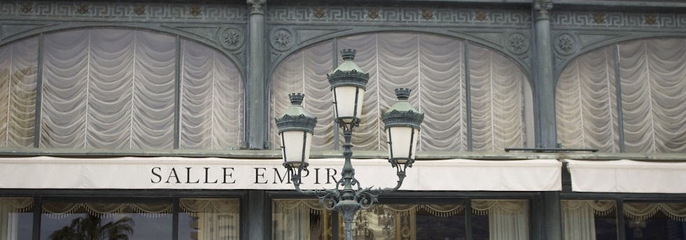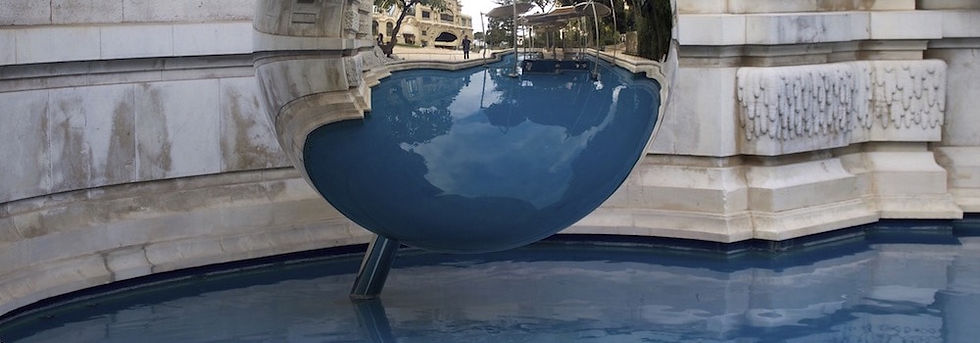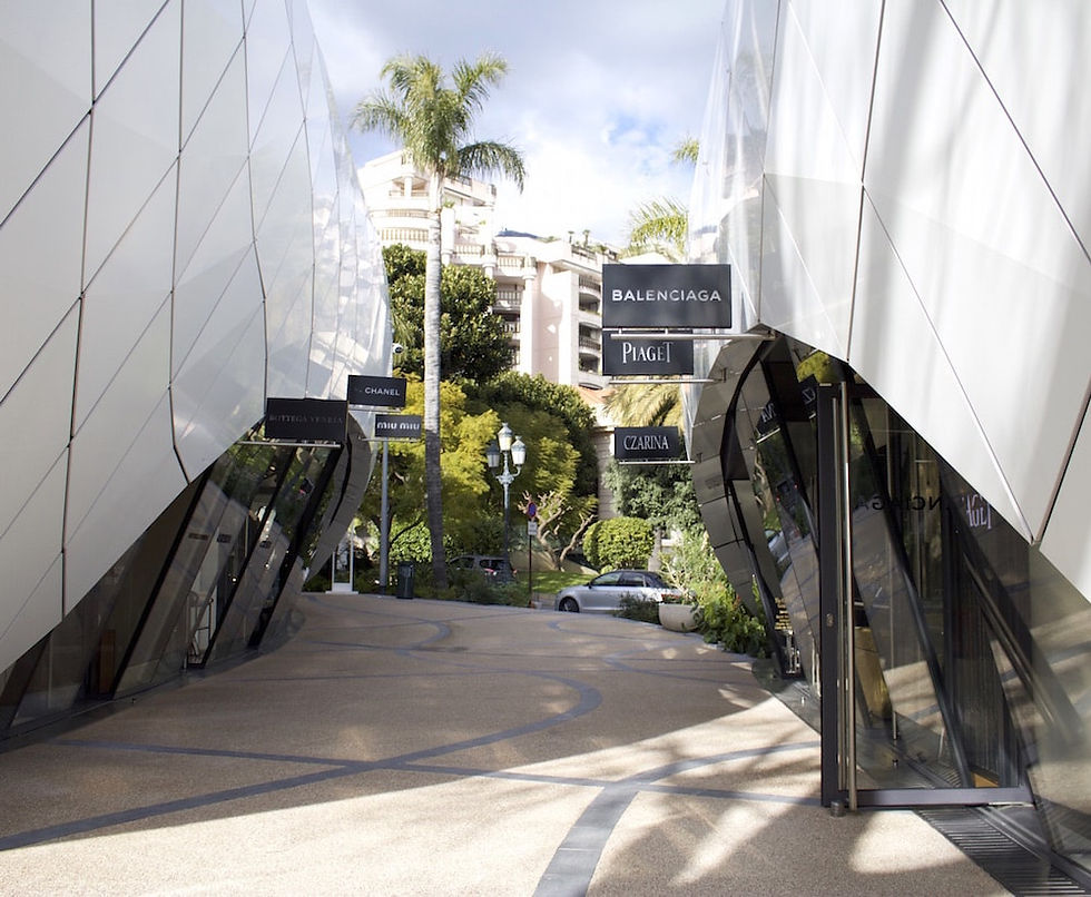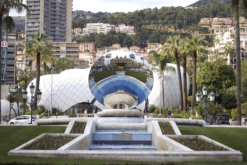 From above the street I already spot the Casino in the distance and in it's front a white large bubble shape, which I consider to be an enormous stent at first. When taking a closer look, it is actually a building, shaped like a cloud or a bubble, softly rounded and partially melt together. The surface isn't plain, but broken up by a futuristic geometric pattern in diamond shape. Not sure what it is, I stroll right in between the small streets between those bubbles, recognizing here that those are shops, but the kind of shops that I wouldn't even set foot on. From Prada, Gucci and Chanel everything can be found here, exclusively expensive and only affordable by a certain clientele. Though there are not many people around, all the small stores tend to have 2 or 3 staff members. They can be seen through the slanted glass sheets that grow upwards from the ground and which are framed by a bow of the white patterned surface. Along those tent like buildings shadowy pathways in a park lead over to the Casino, the main emblem of Monaco, and is framed by benches on which I sit down to have a snack. While sitting here, eating my two euro cos-cous from a plastic bowl with a camping fork, unkempt hair, beach shorts and a plain shirt, I feel strangely out of place. Men dressed in suit and tie, mainly in company with a woman wearing skirt, blouse and blazer or a designer dress with matching jewelry and accessories, are passing by frequently. Just by the looks you can tell that their wallet surely is figuratively weighing more than my backpack does.