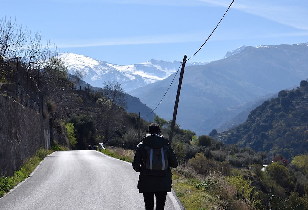The bus slants into a halt at a little square in Güejar Sierra Nevada, a small village that serves as starting point for many hikers to do daytrips or longer tours into the mountains. We equip ourselves with a map and further information, thereby sticking to recommendations of our host Nico that the 'Camino de Estrella' would be a nice walk for a day hike. Unfortunately the direct start of the pathway is located further outside the village therefore we have to follow the street for about an hour until we finally can start the proper paths. Futile attempts to hitchhike this segment are turned down by all the very few cars that pass us here. Anyways we walk in a fast pace, in the far off distance the high peaks covered partially with snow are smirking down at us, and I can't do anything but admire their wild, majestic beauty.